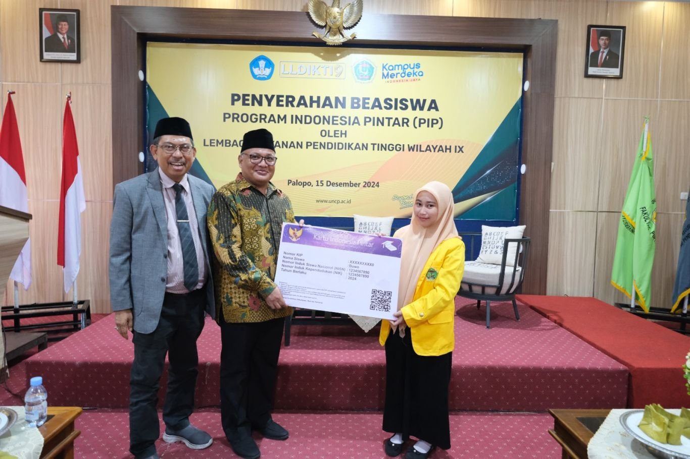 Hadir dalam penyerahan beasiswa PIP, Rektor UNCP, Rahman Hairuddin, SP, M.Si, pimpinan perguruan tinggi di wilayah Luwu Raya dan Tana Toraja serta mahasiswa penerima.