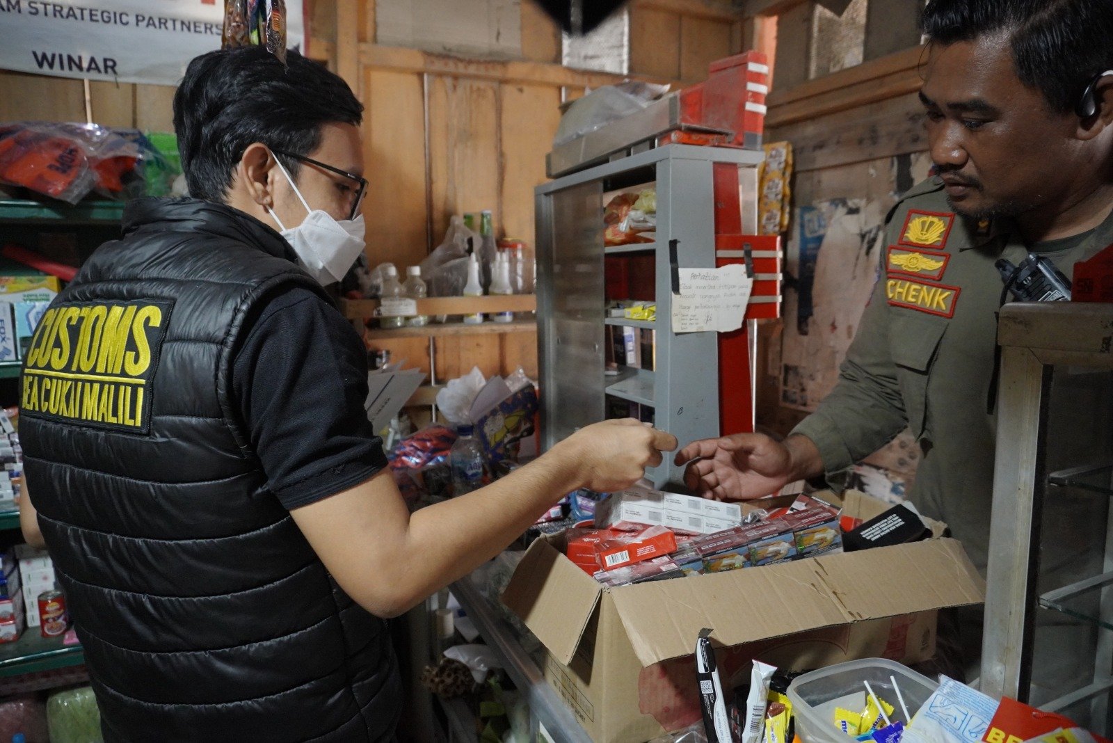 Petugas Bea Cukai Malili bersama anggota Satpol PP Luwu memeriksa rokok tanpa pita cukai saat pelaksanaan Operasi Pasar Pemberantasan Rokok Ilegal di Kecamatan Belopa, Kabupaten Luwu, Senin (6/10/2025). (ist)