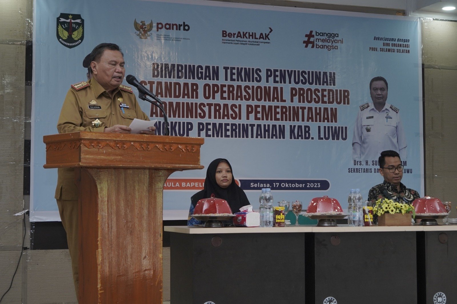 LUWU, TEKAPE.co – Sekretaris Daerah Kabupaten Luwu, Drs. Sulaiman, secara resmi membuka kegiatan Bimbingan Teknis Penyusunan Standar Operasional Prosedur (SOP) Administrasi Pemerintahan yang diselenggarakan oleh Bagian Organisasi Setda Luwu di aula Kantor Bappelitbangda, Selasa, 17 Oktober 2023.
