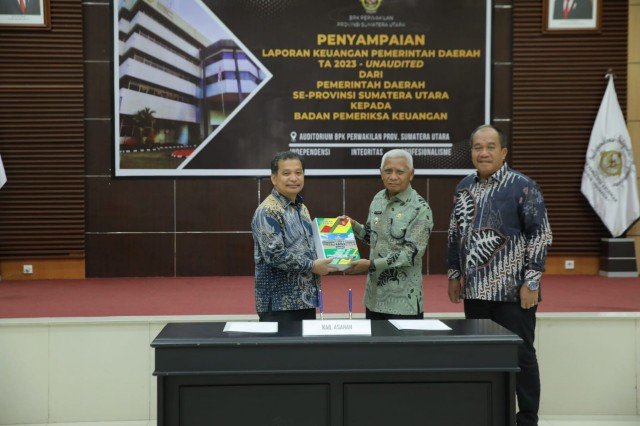 ASAHAN, TEKAPE.co– Pemerintah Kabupaten Asahan menyerahkan Laporan Keuangan Pemerintah Daerah (LKPD) Unaudited tahun anggaran 2023 kepada Badan Pemeriksa Keuangan (BPK) perwakilan Sumatera Utara, bertempat di Auditorium BPK RI Perwakilan Provinsi Sumatera Utara Jalan Imam Bonjol Medan, Rabu (20/03/2024).