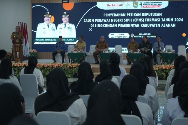 ASAHAN, TEKAPE.co – Calon Pegawai Negeri Sipil (CPNS) di lingkungan Pemerintah Kabupaten Asahan diminta dapat memahami visi dan misi Pemkab Asahan mewujudkan Asahan yang sejahtera, religius, maju dan berkelanjutan.Hal itu disampaikan Bupati Asahan Taufik Zainal Abidin Siregar dalam acara penyerahan petikan SK pengangkatan kepada 148 orang CPNS di lingkungan Pemkab Asahan, Senin (02/06/2025) di Aula Melati kantor bupati setempat.Bupati Asahan yang pernah mengawali karier sebagai staf di kecamatan meminta para CPNS untuk melaksanakan tugas dan mentaati peraturan perundang – undangan yang berlaku serta mendukung visi dan misi Pemkab Asahan.