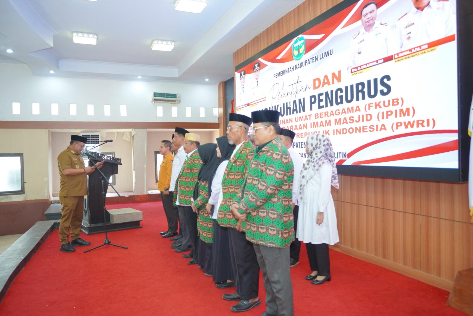 Pelantikan dan pengukuhan pengurus Forum Kerukunan Umat Beragama (FKUB), Ittihad Persatuan Imam Masjid (IPIM), dan Persatuan Wredatama Republik Indonesia (PWRI) Kabupaten Luwu tahun 2025 di Ruang Pola Andi Kambo, Kantor Bupati Luwu, Selasa (30/9/2025). (ist)