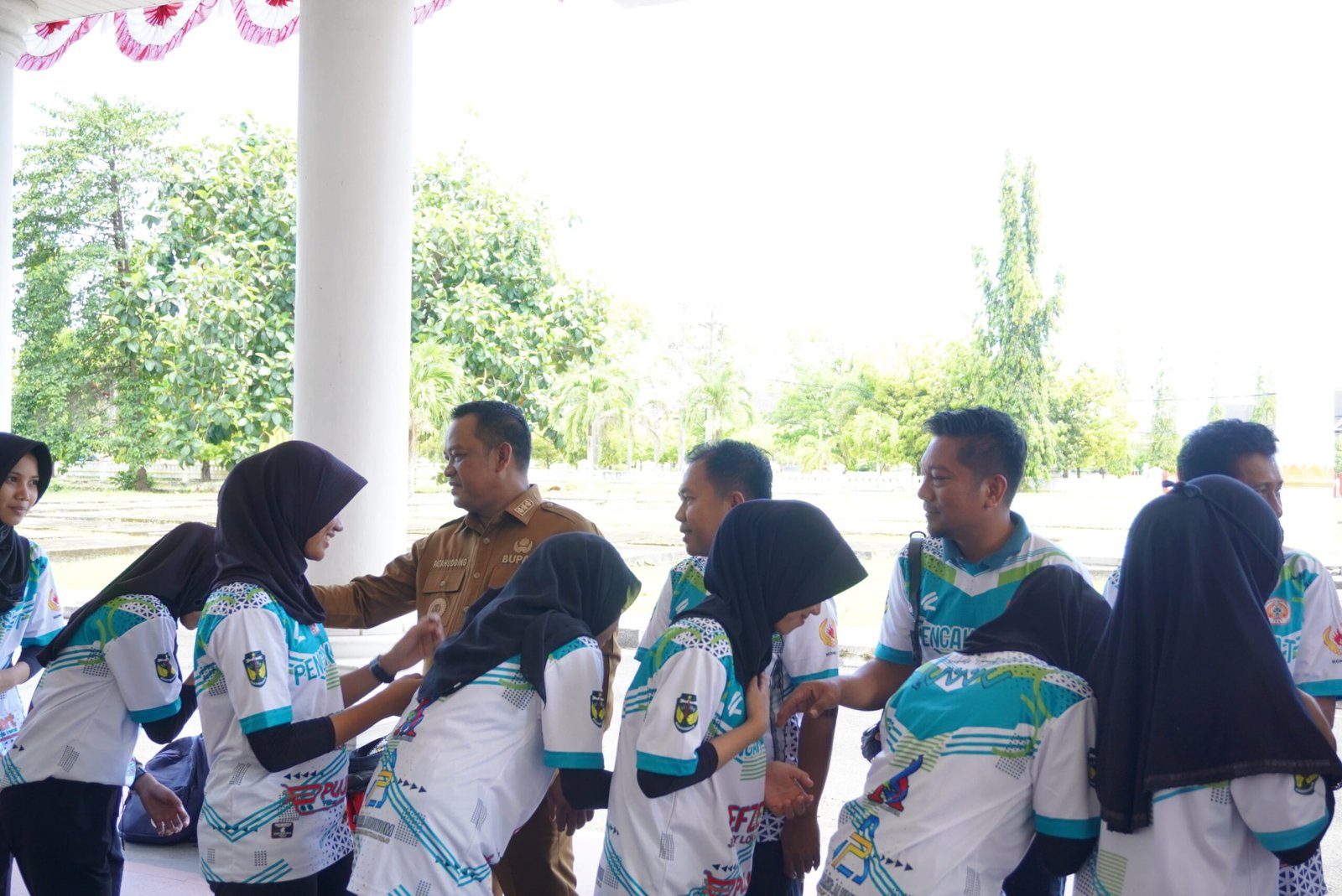 Bupati Luwu, Patahudding, menyalami dan memberi semangat kepada atlet pencak silat Kabupaten Luwu yang akan berlaga pada Pra Porprov Sulawesi Selatan 2025 di Kota Parepare, usai acara pelepasan di halaman Kantor Bupati Luwu, Belopa, Senin, 27 Oktober 2025. (ist)