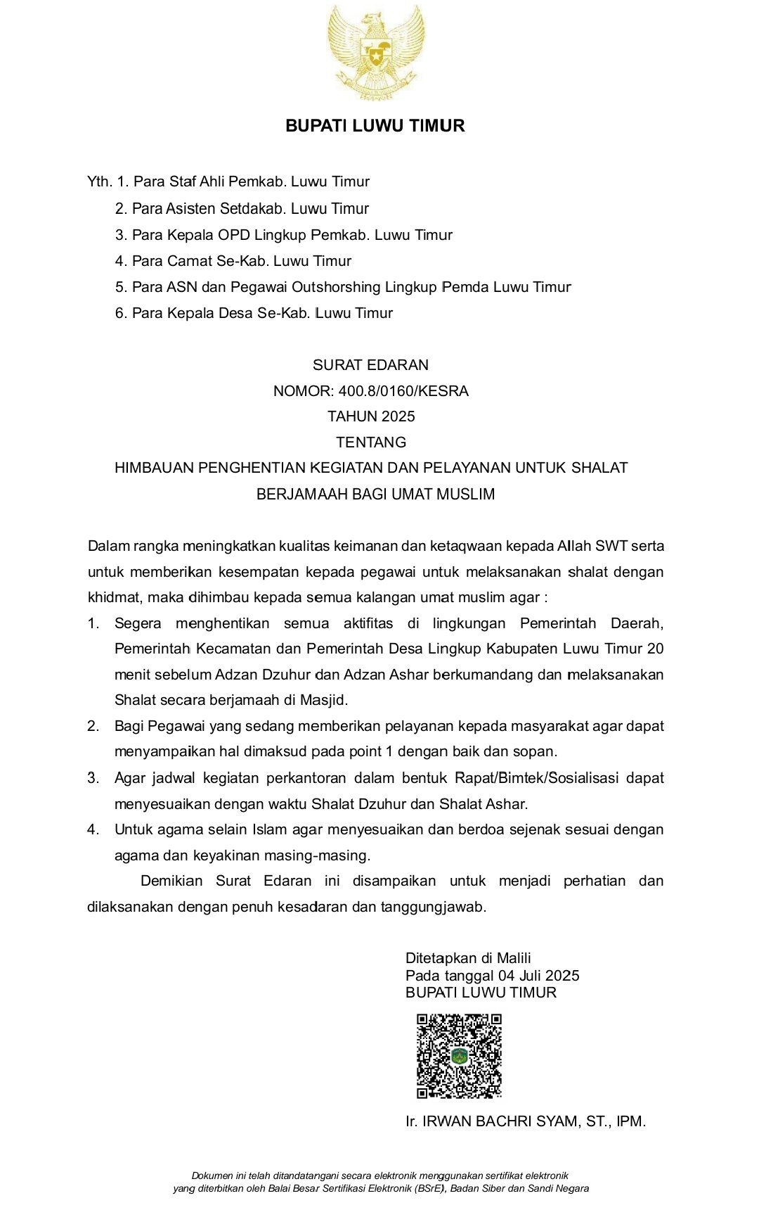MALILI, TEKAPE.co – Bupati Luwu Timur, Ir Irwan Bachri Syam ST IPM, resmi mengeluarkan Surat Edaran Nomor: 400.8/0160/KESRA Tahun 2025 tentang Himbauan Penghentian Kegiatan dan Pelayanan untuk Shalat Berjamaah bagi Umat Muslim di lingkungan Pemerintah Kabupaten Luwu Timur.