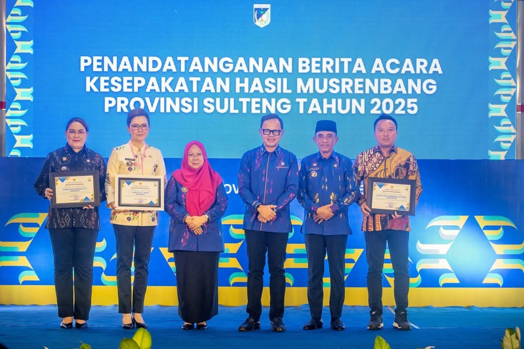 Bupati Delis J. Hehi menerima Piagam Penghargaan sebagai Terbaik III dalam kategori Kinerja Penurunan Tingkat Kemiskinan Provinsi Sulteng untuk periode 2023–2024.
