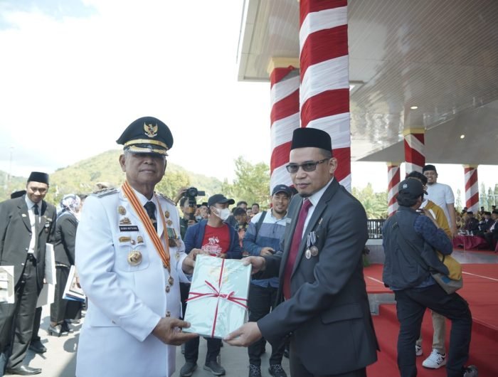 LUWU, TEKAPE.co – Bupati Luwu, Dr. Drs. H Basmin Mattayang, MPd menyerahkan piagam penghargaan dan hadiah kepada pemenang lomba inovasi daerah antar Organisasi Perangkat Daerah (OPD) dan Puskesmas se Kabupaten Luwu tahun 2023, usai melaksanakan upacara peringatan detik-detik proklamasi dalam rangka Hari Ulang Tahun (HUT) ke-78 Kemerdekaan Republik Indonesia yang dilaksanakan di lapangan Andi Djemma Kelurahan Senga Kecamatan Belopa, Kamis, 17 Agustus 2023.