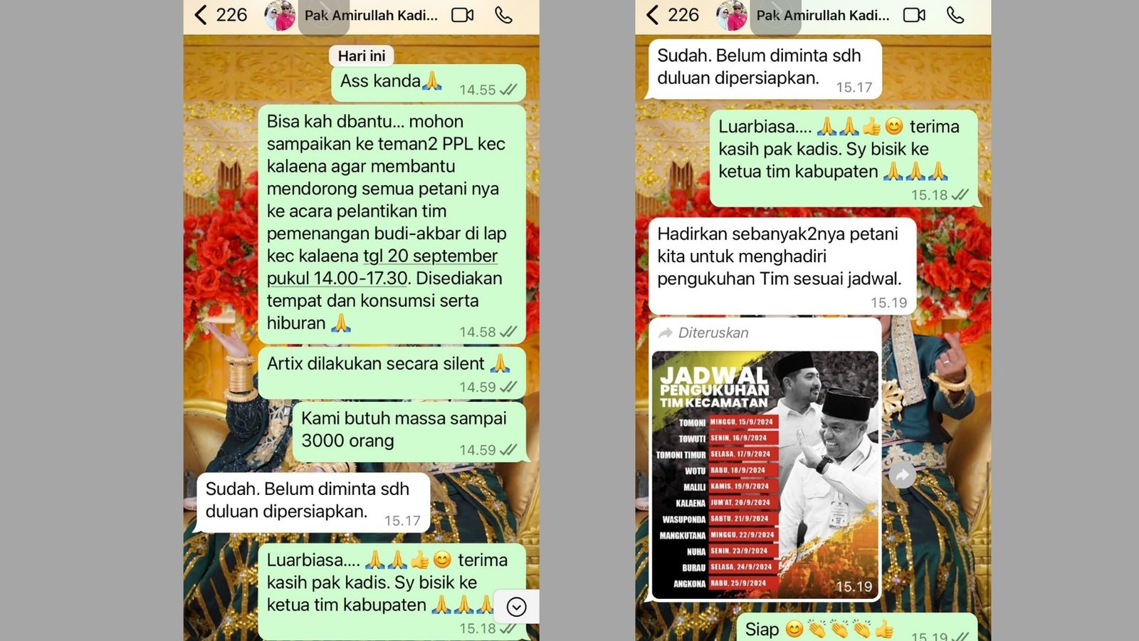 Heboh tangkapan layar berisi chat WhatsApp Kepala Dinas Pertanian Luwu Timur, Amrullah Rasyid dengan tim pemenangan calon petahana Budiman-Akbar, Selasa (17/9/2024) malam.