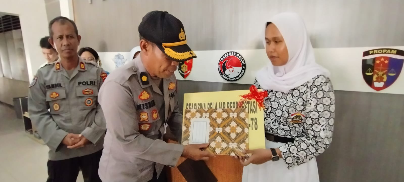 Penyerahan bantuan beasiswa kepada anak anggota Polri yang berprestasi berlangsung di ruang Lobby Sanika Satyawada Polres Palopo pada Kamis 27 Juni 2024.