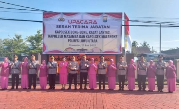 LUWU UTARA, TEKAPE.co — Kepolisian Resor (Polres) Luwu Utara kembali melakukan rotasi jabatan di jajaran perwira. Upacara serah terima jabatan (Sertijab) tersebut dipimpin langsung oleh Kapolres Luwu Utara, AKBP Nugraha Pamungkas SIK MH, Kamis pagi, 12 Juni 2025, di lapangan Mapolres Luwu Utara.