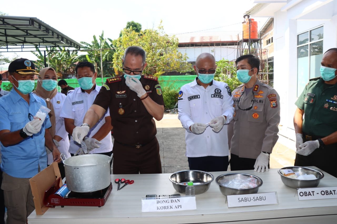 Sabu dimusnahkan dengan cara direbus, sementara obat-obatan, kantong plastik, serta sejumlah barang bukti lain dibakar.