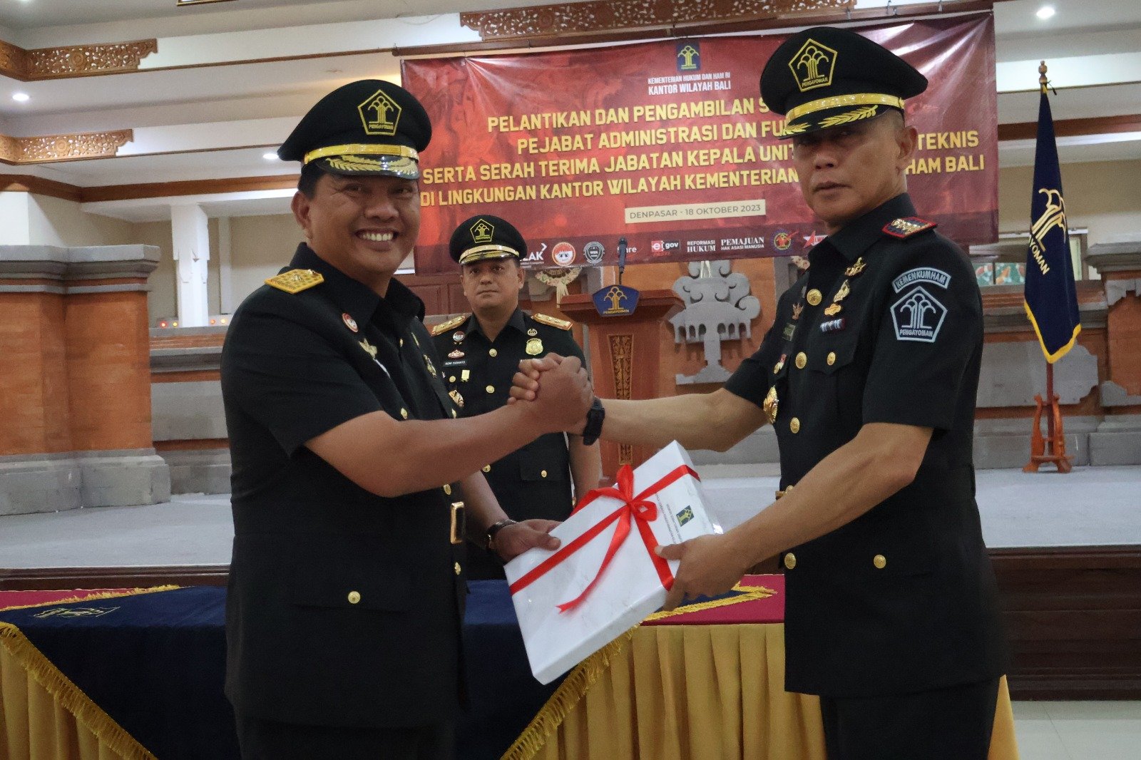 Sejalan dengan pelantikan dan pengambilan sumpah, dilaksanakan juga kegiatan Serah Terima Jabatan Kepala Lembaga Pemasyarakatan Kelas IIA Kerobokan dari Fikri Jaya Soebing kepada Raden Mas Kristyo Nugorho dan Kepala Rumah Tahanan Kelas IIB Bangli dari Agus Setiawan kepada Dedi Nugroho.