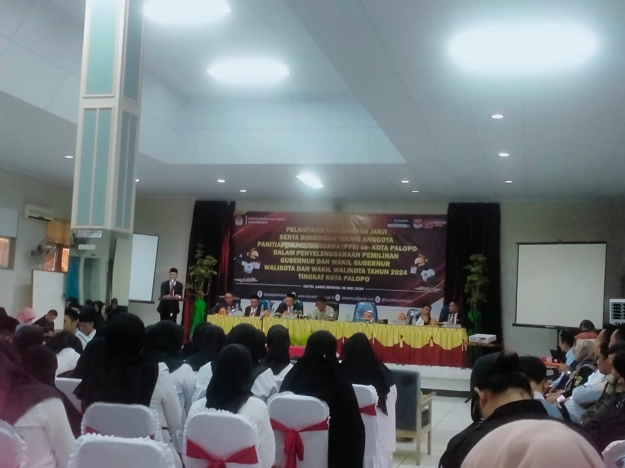 Pelantikan dan mengambil sumpah Panitia Pemungutan Suara (PPS) tingkat kelurahan untuk Pemilihan Kepala Daerah (Pilkada) Kota Palopo 2024 di Hotel Agro Kota Palopo, Minggu 26 Mei 2024. (ist)