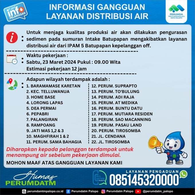“Pengurasan akan dilakukan besok (Sabtu) sekira pukul 09.00 Wita,” kata Humas Perumda Tirta Mangkaluku, Novita Sari Basmin, Jumat 22 Maret 2924.