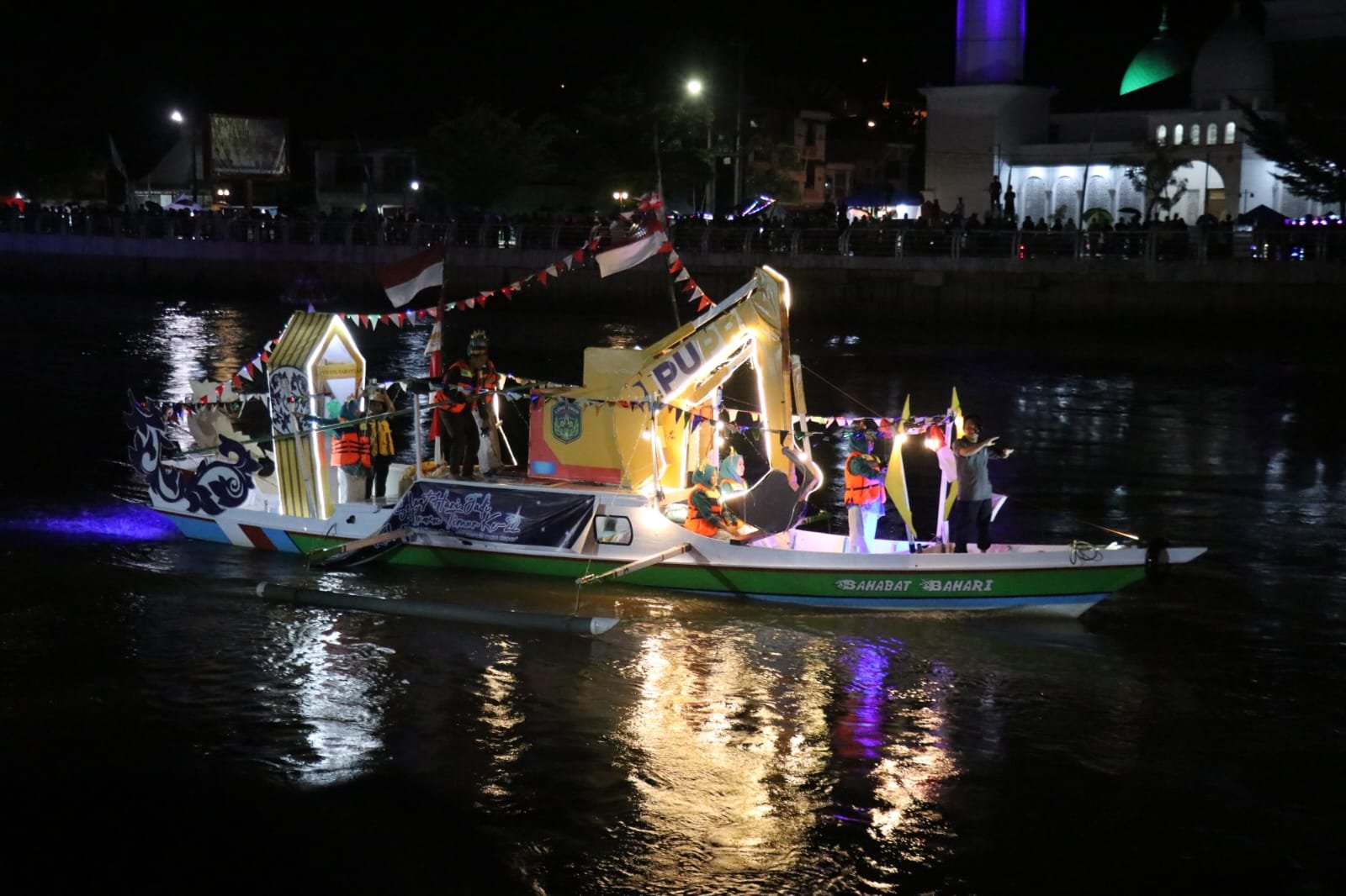 Tidak hanya sekadar hiasan, para peserta juga mengenakan pakaian adat meramaikan perahu mencuri perhatian. Sorak sorai penonton pun semakin menambah semarak suasana malam itu.