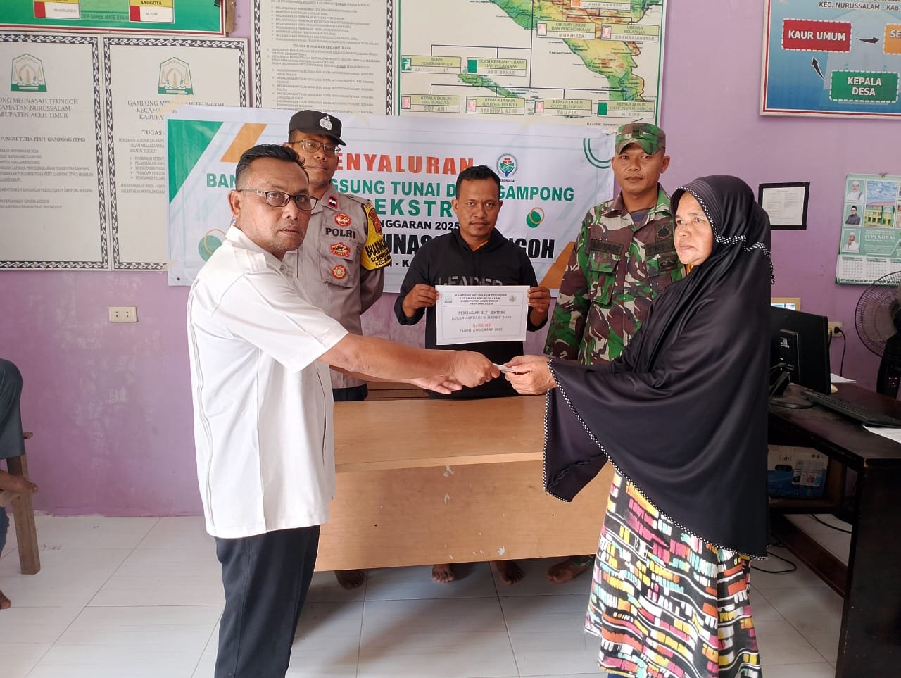 ACEH TIMUR, TEKAPE.co – Menjelang perayaan Idul Fitri 1446 H, Pemerintah Gampong Meunasah Teungoeh, Kecamatan Nurussalam, Kabupaten Aceh Timur, menyalurkan Bantuan Langsung Tunai Dana Desa (BLT-DD) Ekstrim kepada 19 keluarga penerima manfaat (KPM). Penyaluran bantuan ini berlangsung di Kantor Keuchik Gampong Meunasah Teungoeh pada Rabu, 26 Maret 2025.