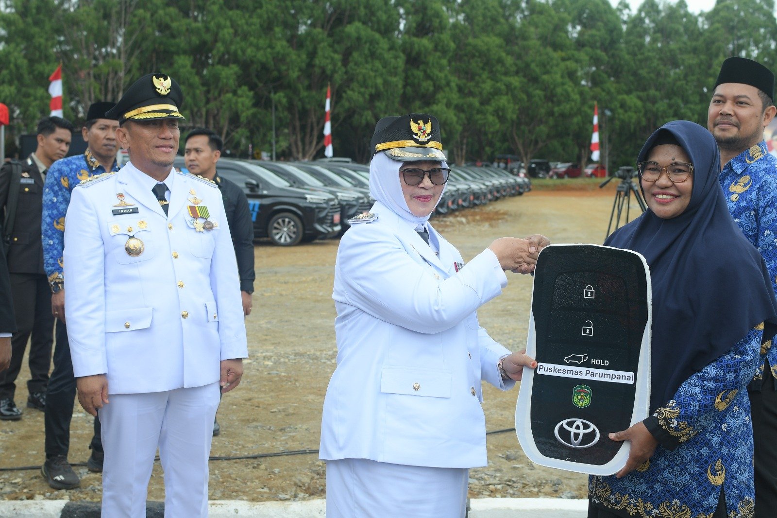 Wakil Bupati Luwu Timur Hj Puspawati Husler menyerahkan mobil operasional Puskesmas pada upacara peringatan Hari Ulang Tahun ke-80 Kemerdekaan Republik Indonesia di Kabupaten Luwu Timur, Minggu (17/8/2025). (ist)