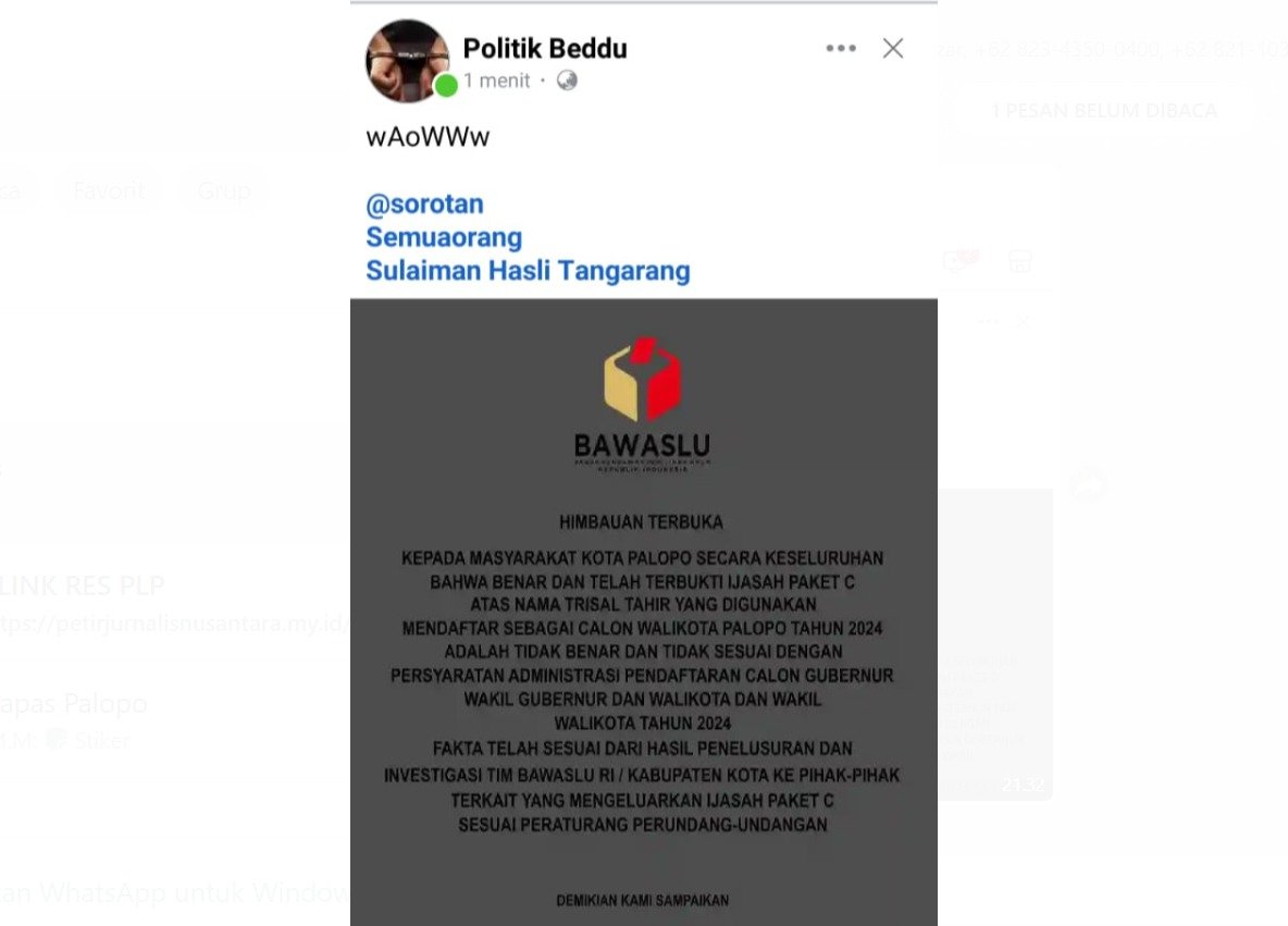 Terlihat di postingan, Bawaslu membenarkan dan telah terbukti ijazah paket C atas nama Trisal Tahir yang digunakan mendaftar sebagai calon wali kota Palopo tahun 2024 adalah tidak benar dan tidak sesuai dengan persyaratan administrasi pendaftaran calon gubernur wakil gubernur, wali kota dan wakil wali kota tahun 2024.