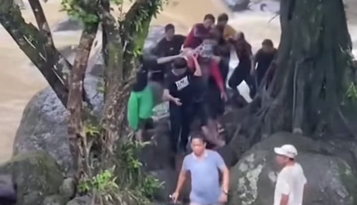 Saat di lokasi, tiba-tiba hujan deras. Meraka memutuskan untuk berteduh, namun korban terpeleset dan jatuh ke sungai yang dipenuhi batu-batu besar.