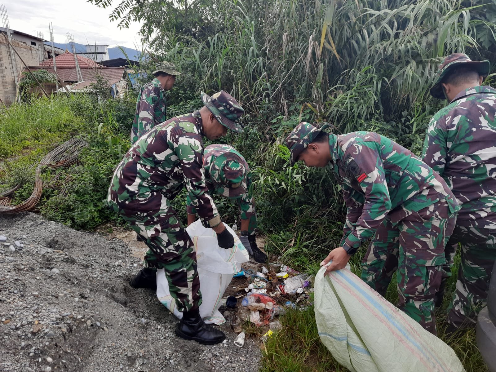 Personel Koramil 1403-15 Malili, Kabupaten Luwu Timur, melakukan bersih-bersih dalam rangka meningkatkan kemanunggalan TNI Rakyat, Minggu 24 Desember 2023. (Dok: Kodim Palopo)
