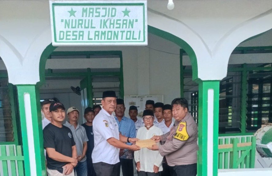 Bantuan dana yang diberikan Polres Morowali melalui Bhabinkamtibmas Desa Lamontoli Bripka Novian Wisnu diterima oleh ketua panitia pembangunan masjid.