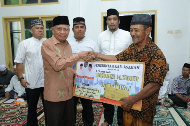 Sebelumnya Bupati Asahan menyerahkan bingkisan kepada Ketua BKM Masjid Al-Mukhlisin berupa uang tunai sebesar Rp. 2.000.000 dan vakum cleaner serta santunan kepada anak yatim sebanyak 25 secara simbolis. (alam)