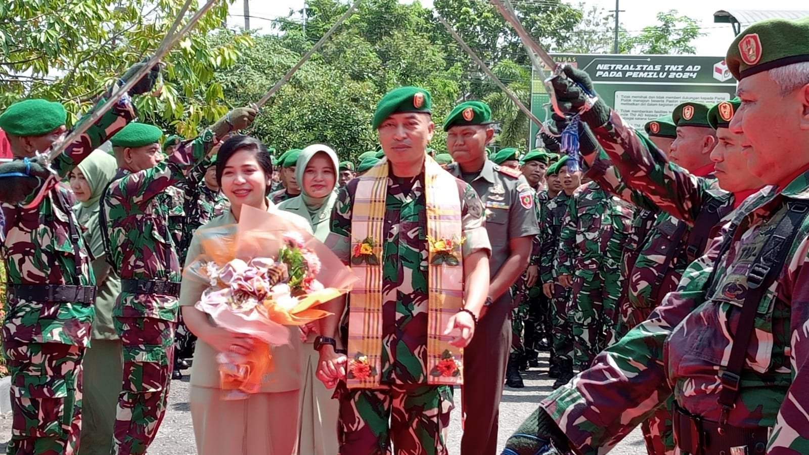 Satu persatu Letkol Inf Apriadi Nidjo didampingi istri menyalami para perwira dan prajuritnya.