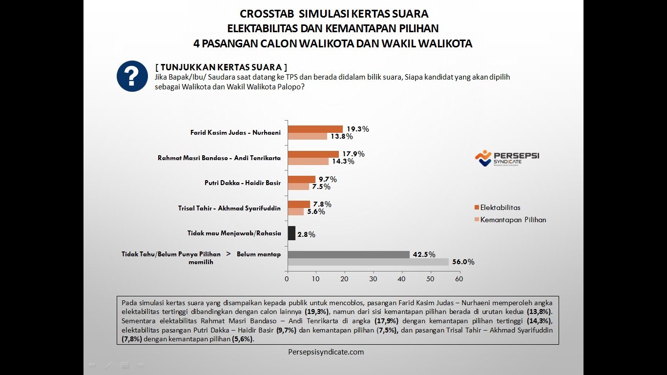 Sedangkan responden yang tidak mau menjawab/rahasia (2,8%) serta tidak tahu/belum punya pilihan (42,5%), serta yang belum mantap dengan pilihannya sebesar (56,0%).