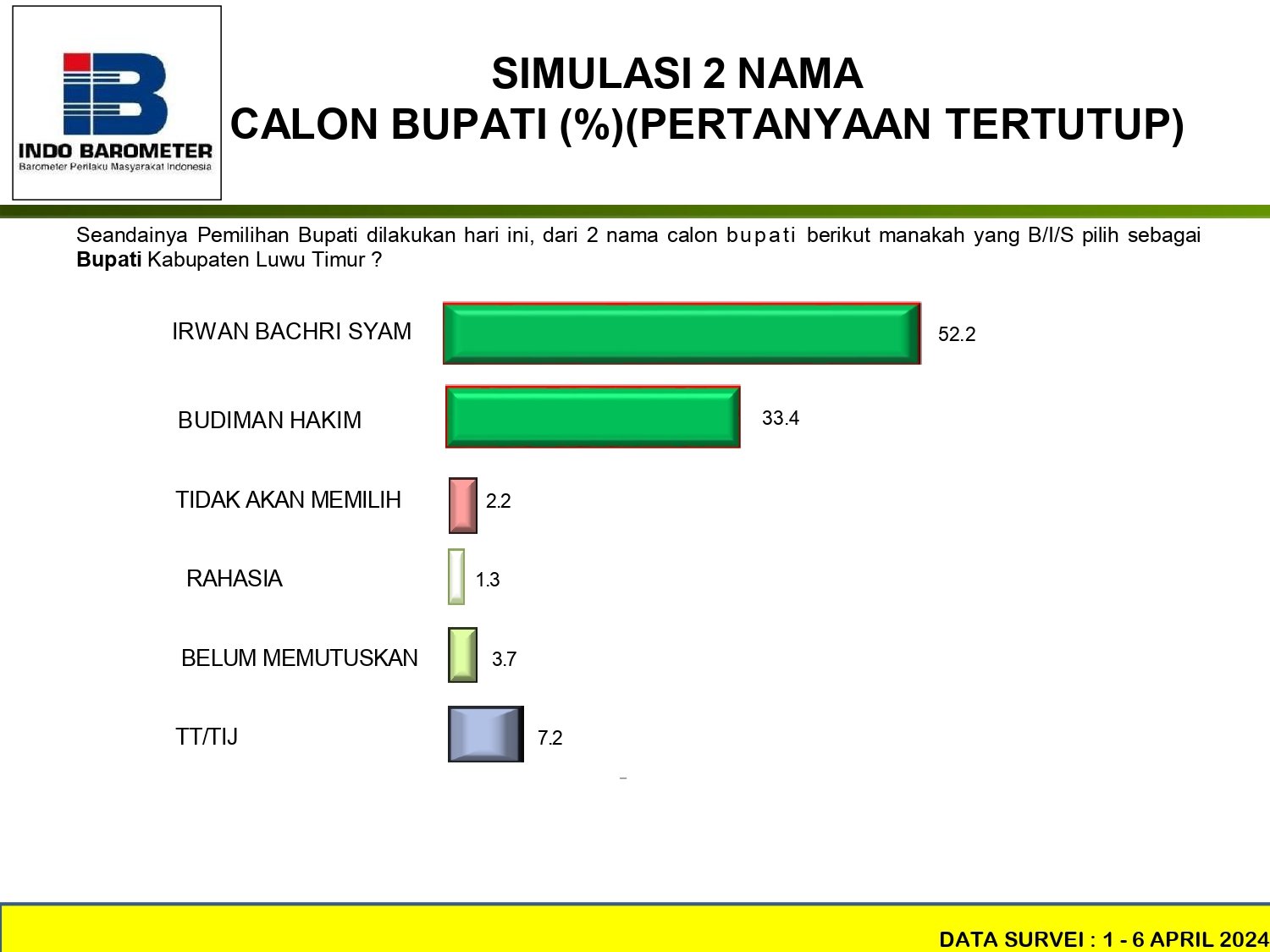 Berdasarkan hasil survei Indo Barometer pertanggal 1 – 6 April 2024 yaitu hasil simulasi dua nama, tingkat keterpilihan atau elektabilitas Irwan Bachri Syam melampaui jauh dari Budiman Hakim.