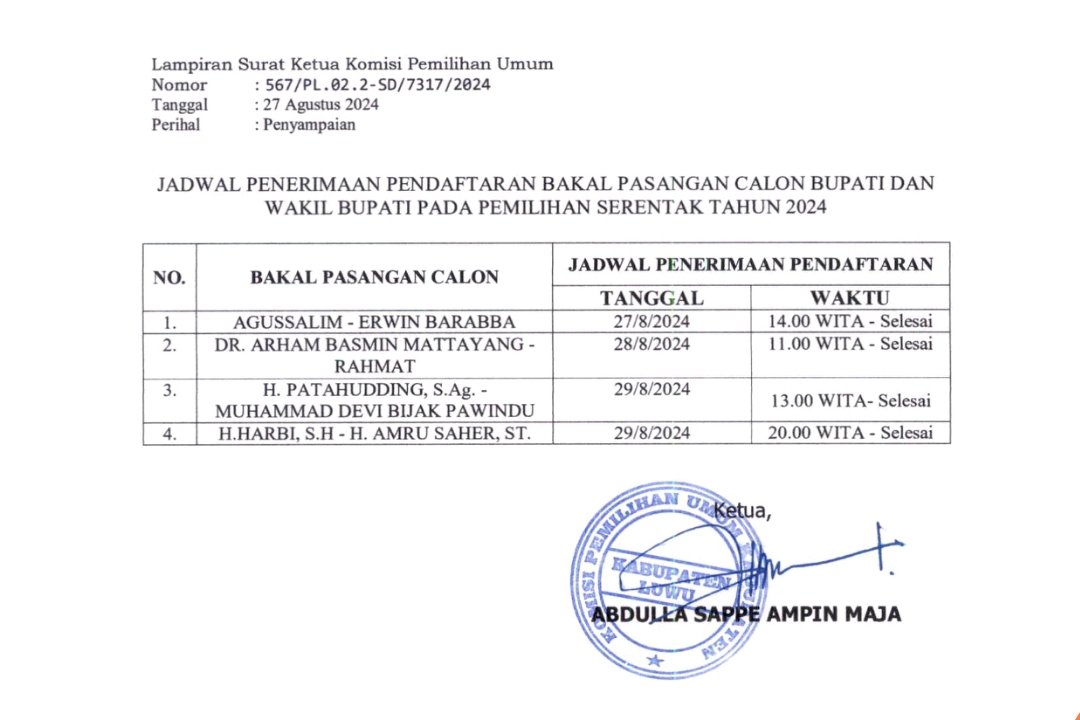 Berikut jadwal pendaftaran Bakal Pasangan Calon Bupati dan Wakil Bupati Luwu 2024: