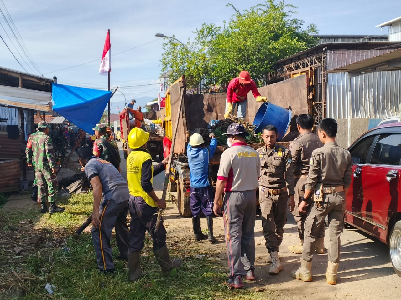 Di tengah-tengah keramaian pasar, Camat Malili bersama personel TNI dari Kodim 1403/Palopo, unsur Polri Luwu Timur, Damkar, Satpol PP, bergotong royong bersama warga, dan komunitas lokal untuk membersihkan sampah di area pasar.