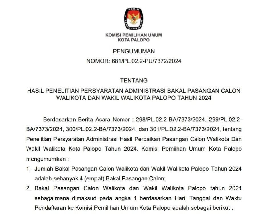 Sementara tiga bakal paslon lainnya, dinyatakan memenuhi syarat administrasi sebagai bakal paslon Walikota dan Wakil Walikota Palopo Tahun 2024.