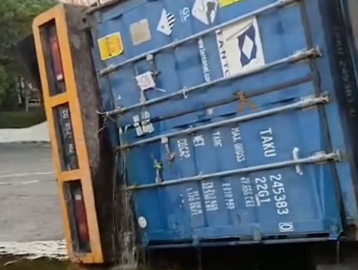 Truk kontainer bermuatan minyak goreng mengalami kecelakaan di Jalan AP Pettarani, Makassar, Kamis 24 Oktober 2024. (ist)